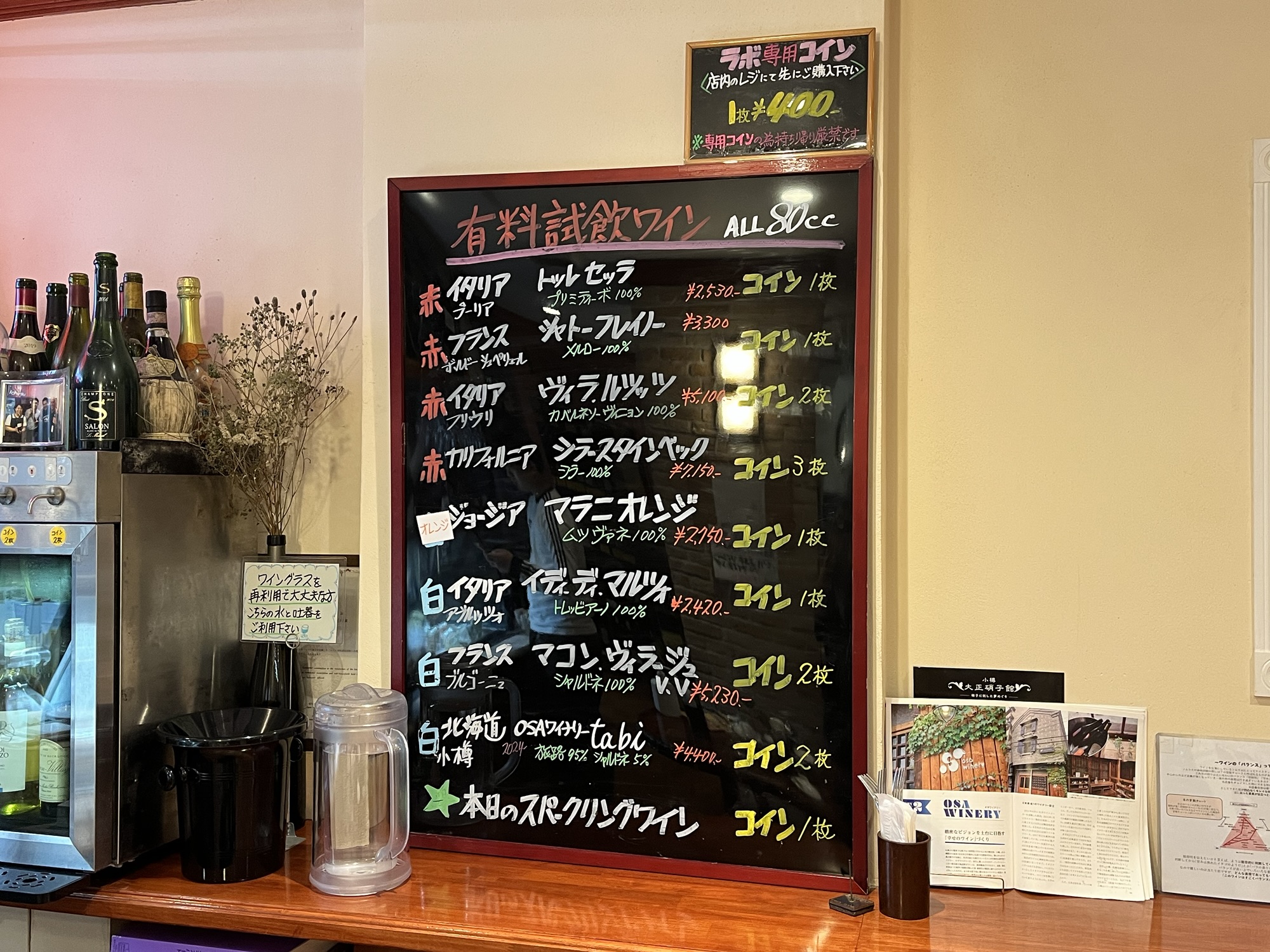1枚400のコインを購入してコインで試飲できます。おすすめのワインは日によって異なるので期間をあけて訪れるとまた違う魅力が!スパークリングワインもあるの嬉しい。