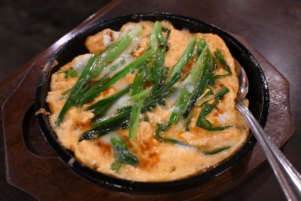 王道の大衆酒場メニュー。熱々の鉄板にふわふわのニラ玉。まずは頼んでおきたいおつまみ。