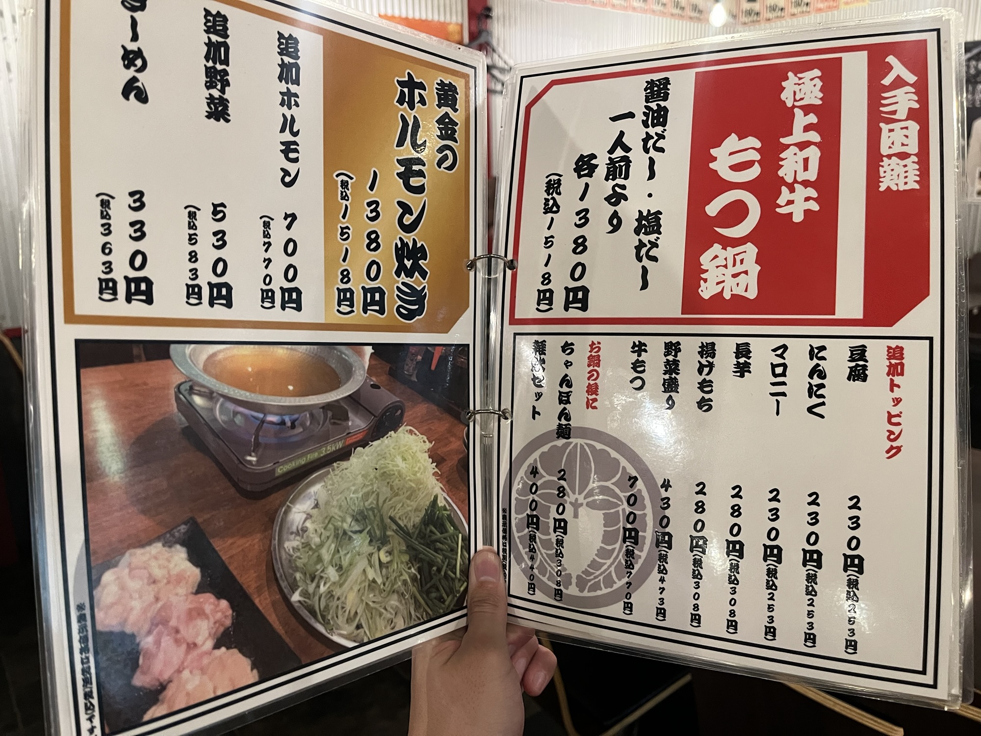 鍋の季節到来。極上和牛もつ鍋は一人前から頼めて驚異の1,518円。写真は一人前。モツに、豆腐、マロニー、キャベツ、など具沢山。追加でトッピングも可能。〆は雑炊とちゃんぽん麺から選べます。一品で飲みのお供として優秀すぎる。