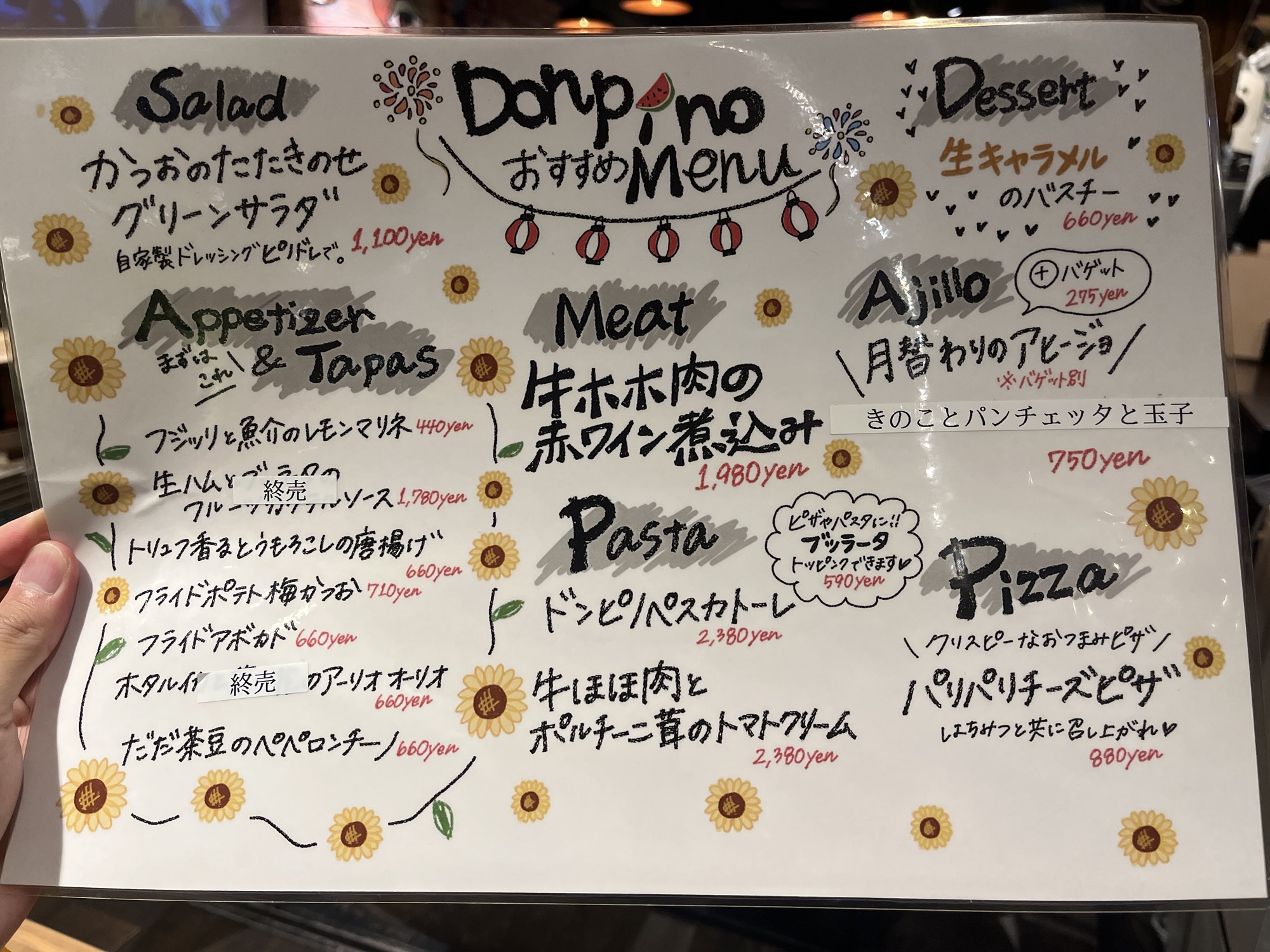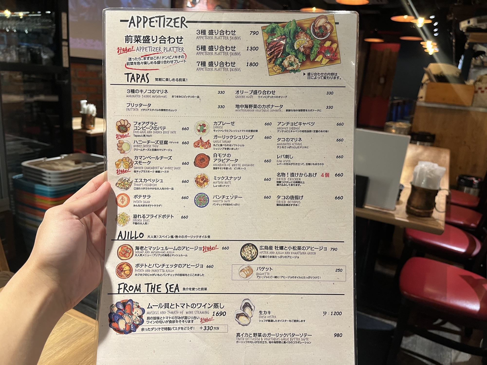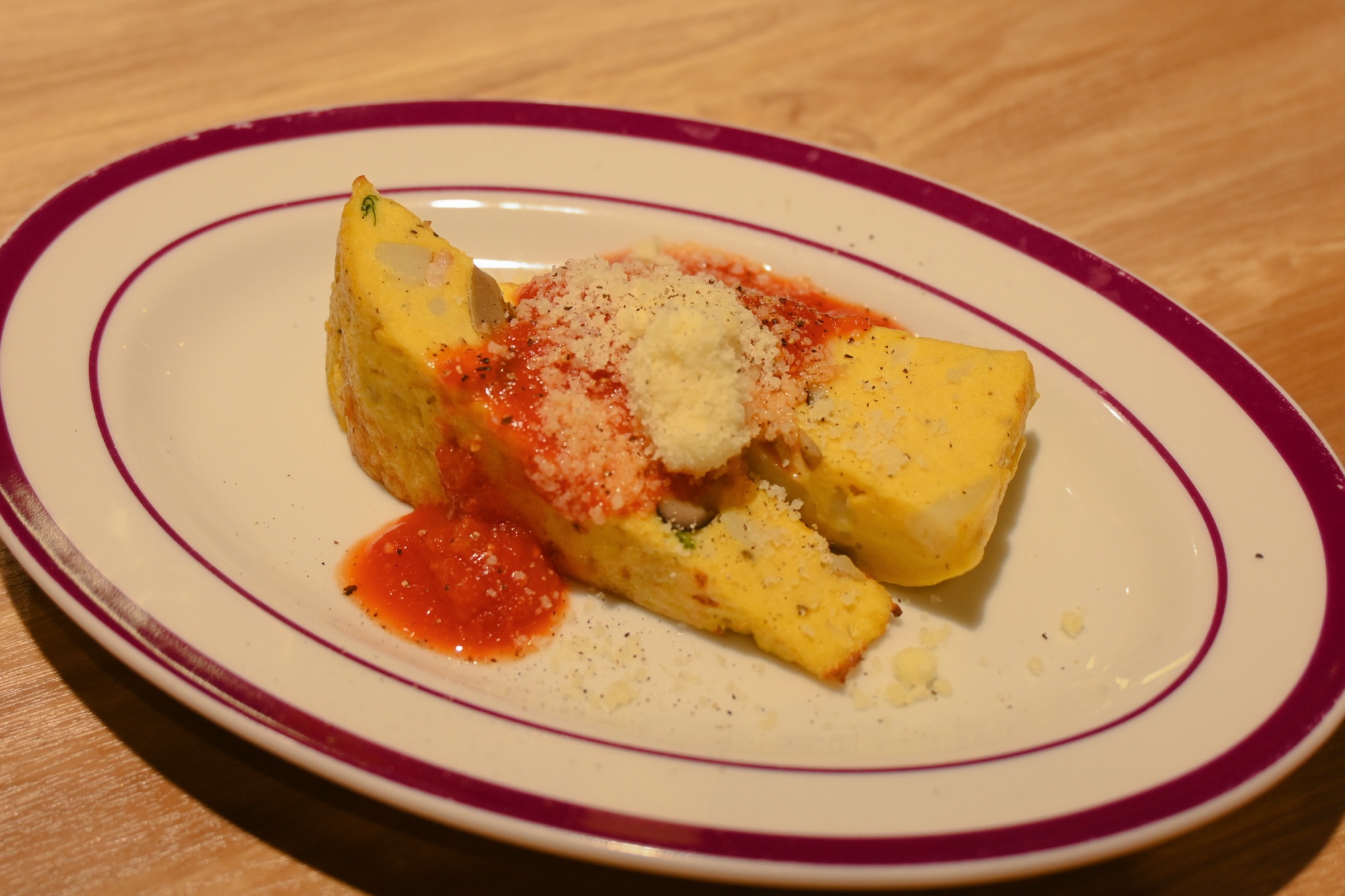 最近ハマっている大山鷄の香草焼き。お肉のしっとり感とパリパリの皮が美味しいのでぜひ食べて欲しい。イタリアのオムレツ、フリッタータや地中海野菜のカポナータなど330円のお手軽前菜も幸福度高め。〆は生パスタのシーフードアラビアータ。