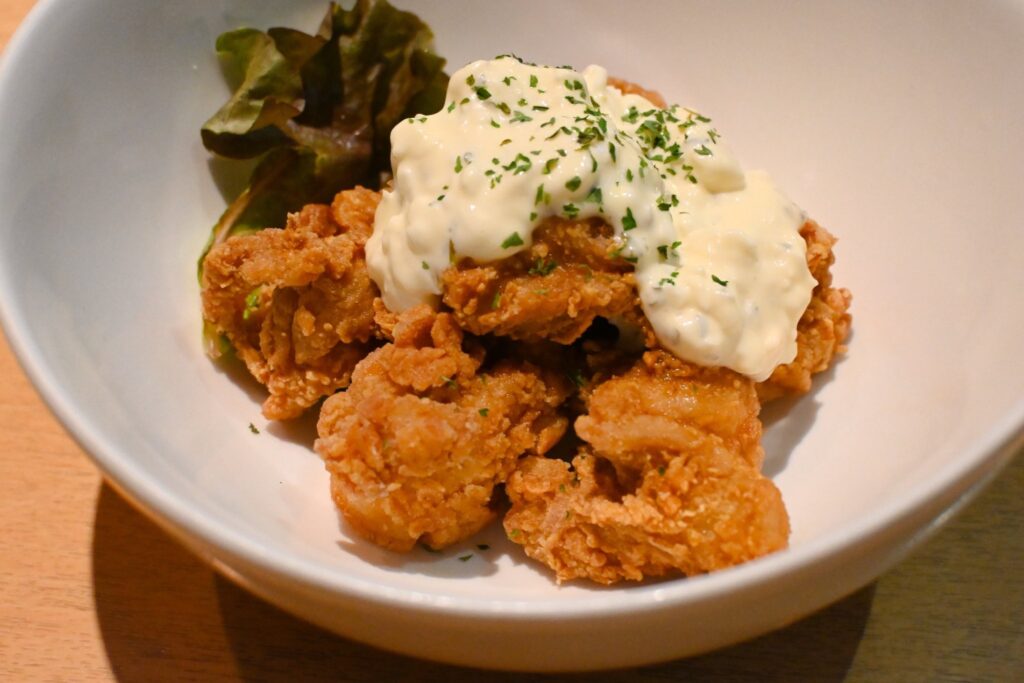 西口にあるカフェバー。 たっぷりチーズのせハンバーグが本当にたっぷり。初体験の鳥取県産大山鷄の唐揚げタルタルがジューシーで本日一。店主おすすめの馬たてがみ刺し自家製味噌タレは酒好きの味方。期間限定の愛媛県産はっさくサワーにハマってます。まだの方急げ。