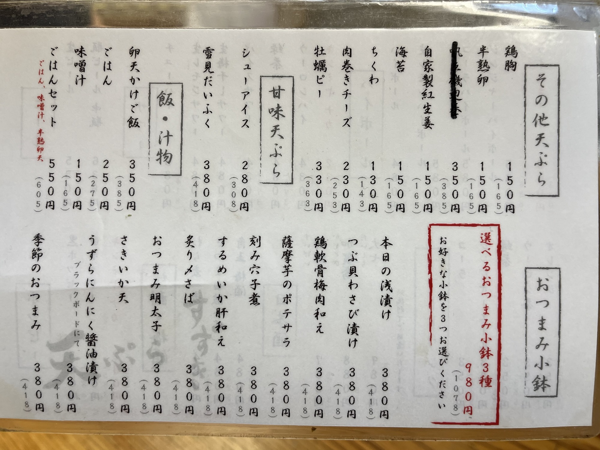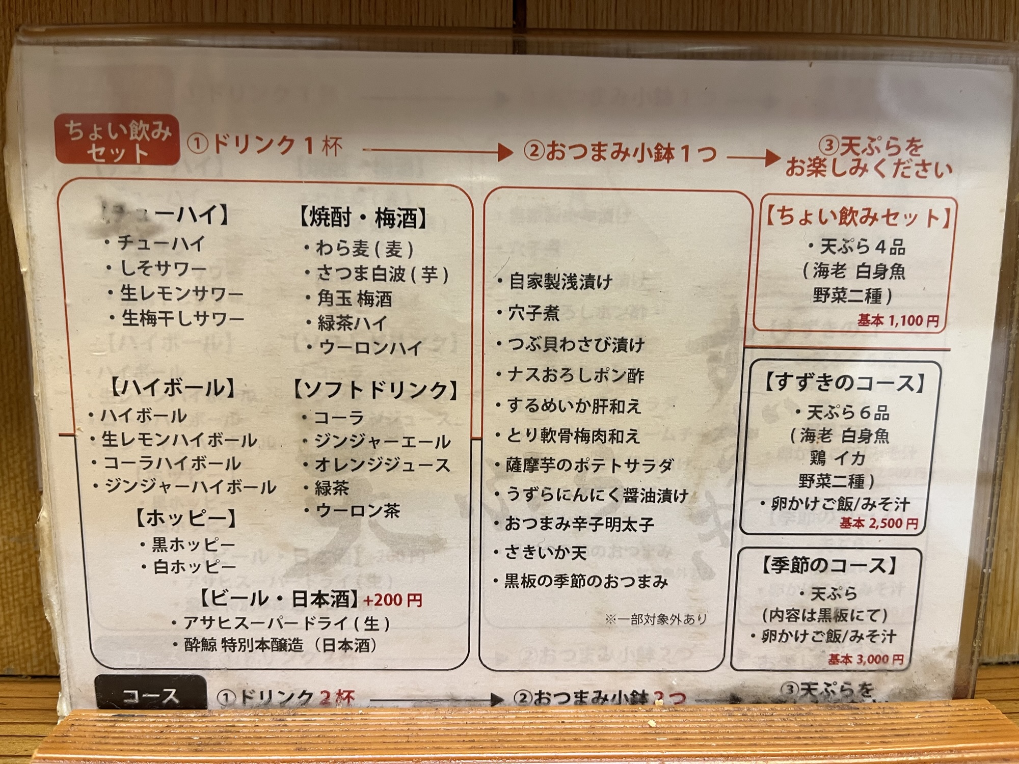 カウンター席揚げたての天ぷらを一品ずつ楽しめる名店。ちょい飲みセットはお酒一杯+おつまみ小鉢+海老白身魚野菜二種せんぜろというお得セット。やはり超絶コスパは健在。追加でイカ天をチョイス。出来立て熱々をいただける喜び。