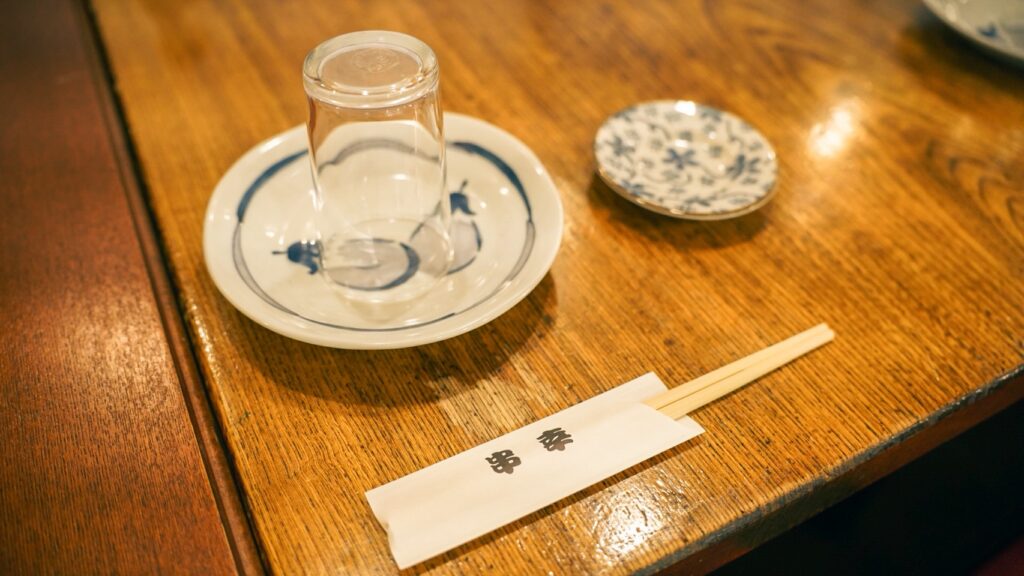 テーブルには小皿と箸、お通しセットが静かに並び、これから始まる宴の予感が漂います。