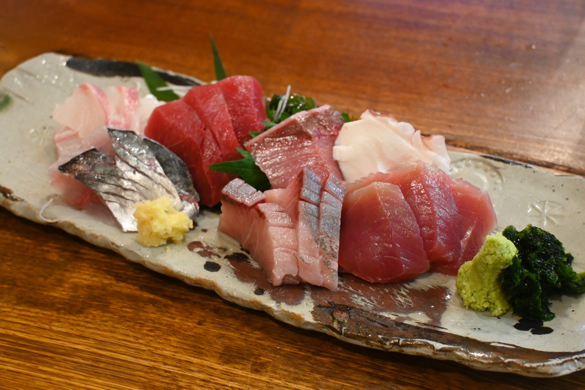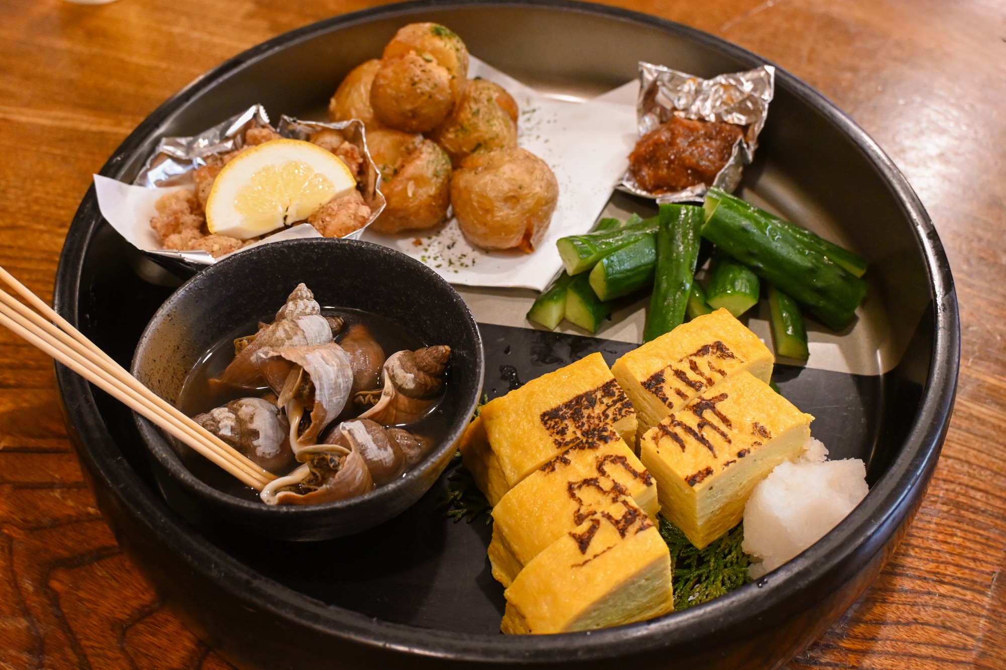 テーブルには小皿と箸、お通しセットが静かに並び、これから始まる宴の予感が漂います。